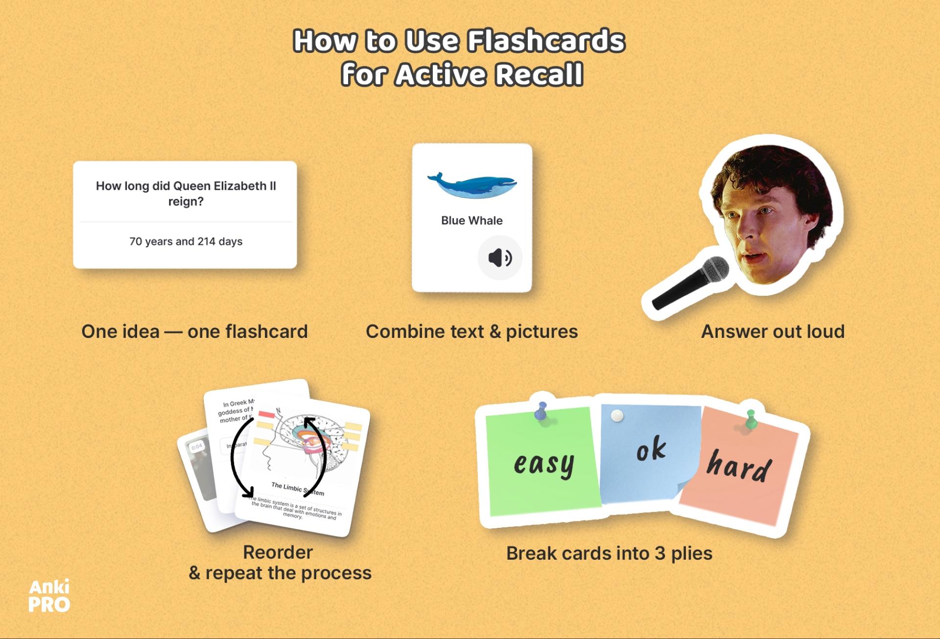 Las técnicas de active recall son muy útiles cuando estudias mucho y, aun así, enfrentas dificultades durante el examen. Funcionan mejor cuando no intentas absorber todo en un corto periodo de tiempo. Como active recall está diseñado para ayudarte a recordar la información «desde cero» y durante un periodo prolongado, seguirás recordando todos estos temas o podrás volver a las tarjetas de estudio usando Anki Pro para refrescar tu memoria y estudiar algo nuevo con facilidad, rapidez y comodidad. Con Anki Pro, el método de active recall funciona al máximo.