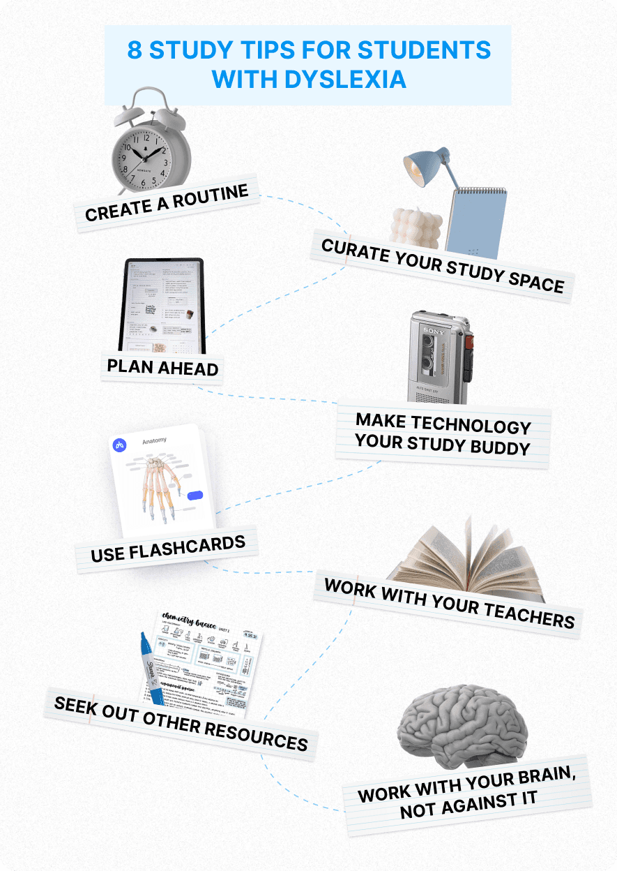 A lot of mainstream study tips are written with neurotypical brains in mind. Here are a few tips that students with dyslexia may find helpful: