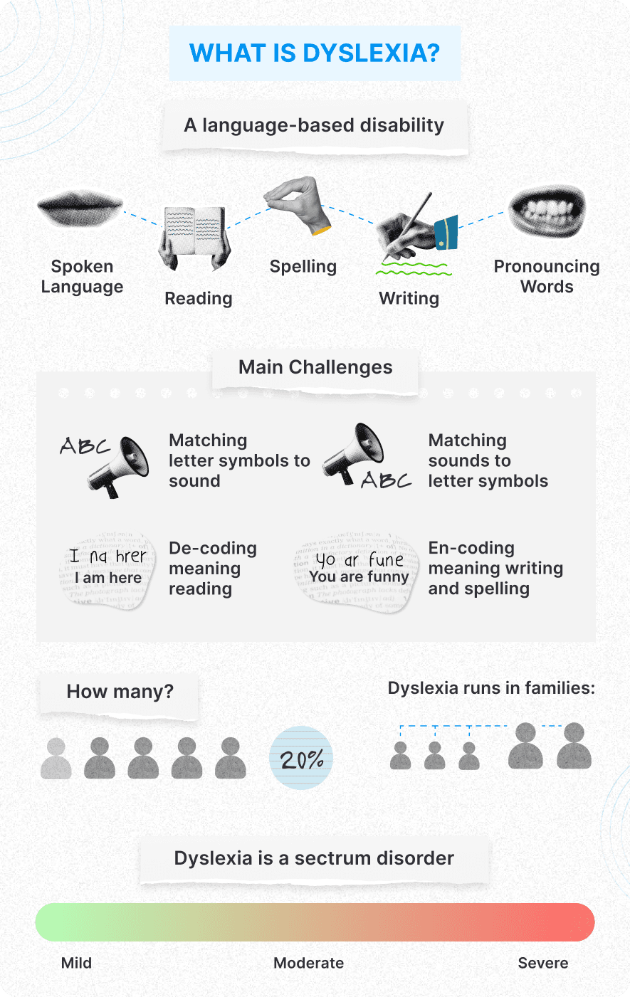 Dyslexia is the most common learning disability. It’s estimated to affect 3-7% of people worldwide. People with dyslexia struggle with reading, writing, and spelling. These difficulties can also lead to trouble learning, grammar, reading comprehension, and delays in developing vocabulary. Dyslexic students are just as bright and motivated as anyone else and can succeed academically with the right support.