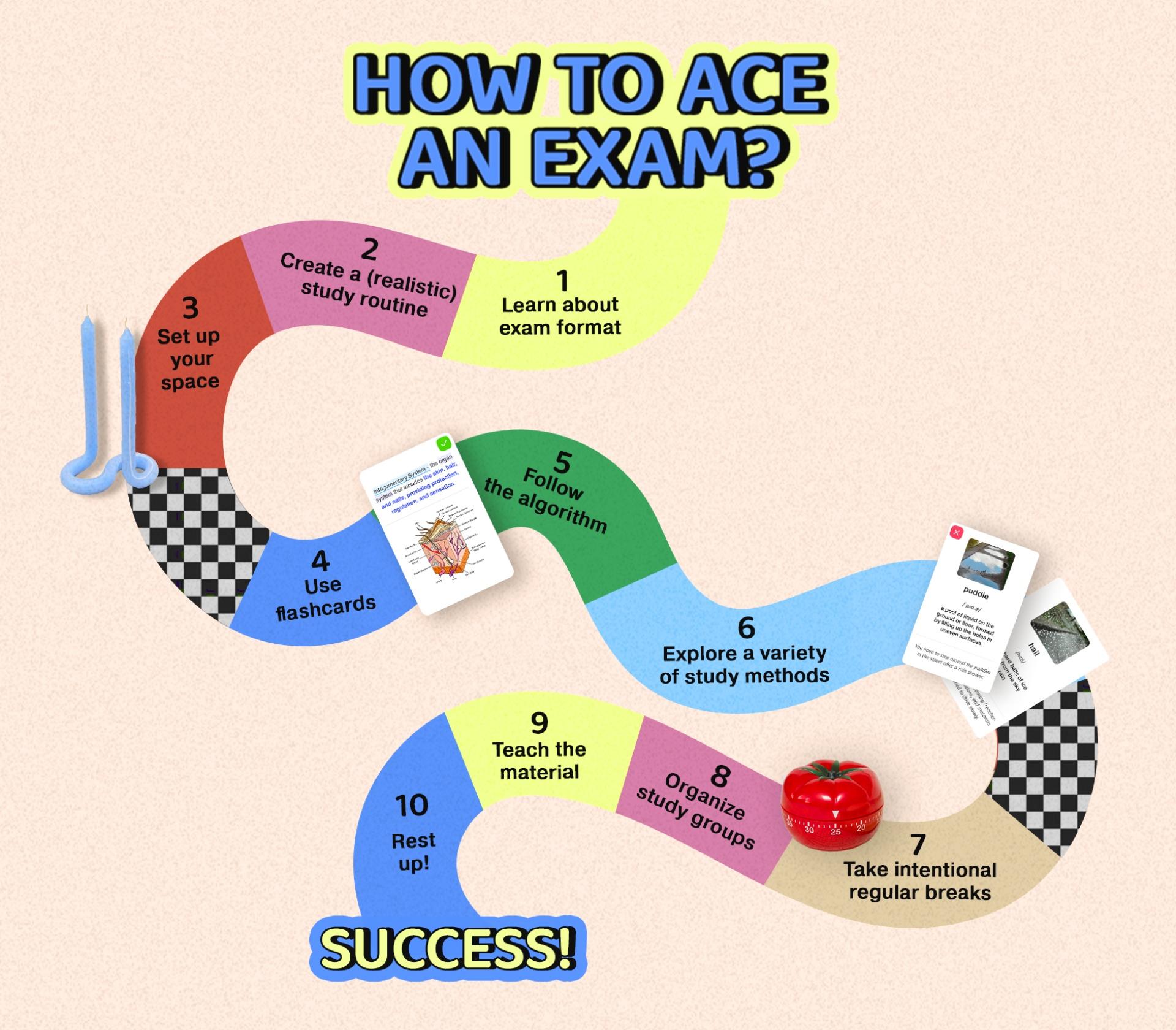 Você passou um tempo entre o algoritmo geral e o de repetição espaçada, e está funcionando, mas gostaria de adicionar um pouco de variedade às suas sessões. A preparação para a prova é uma ótima chance de explorar diferentes métodos de estudo e dicas para exames!